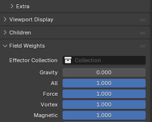 Field Weights 에서 Gravity(중력)값을 0으로 설정하면 파티클이 움직이지 않는 것을 볼 수 있다.
