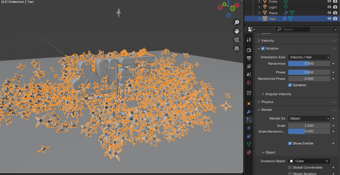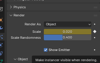 Render에서 파티클 스케일 1 적용 후, Scale Randomness 0.4 적용