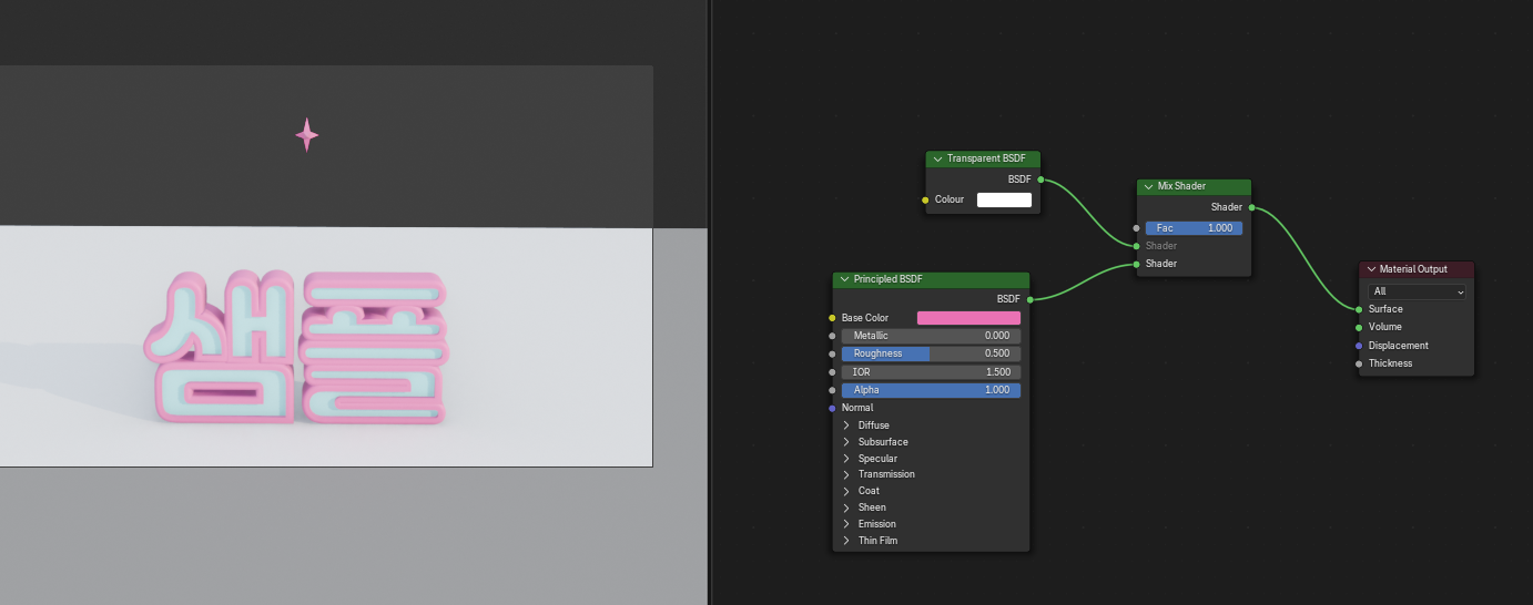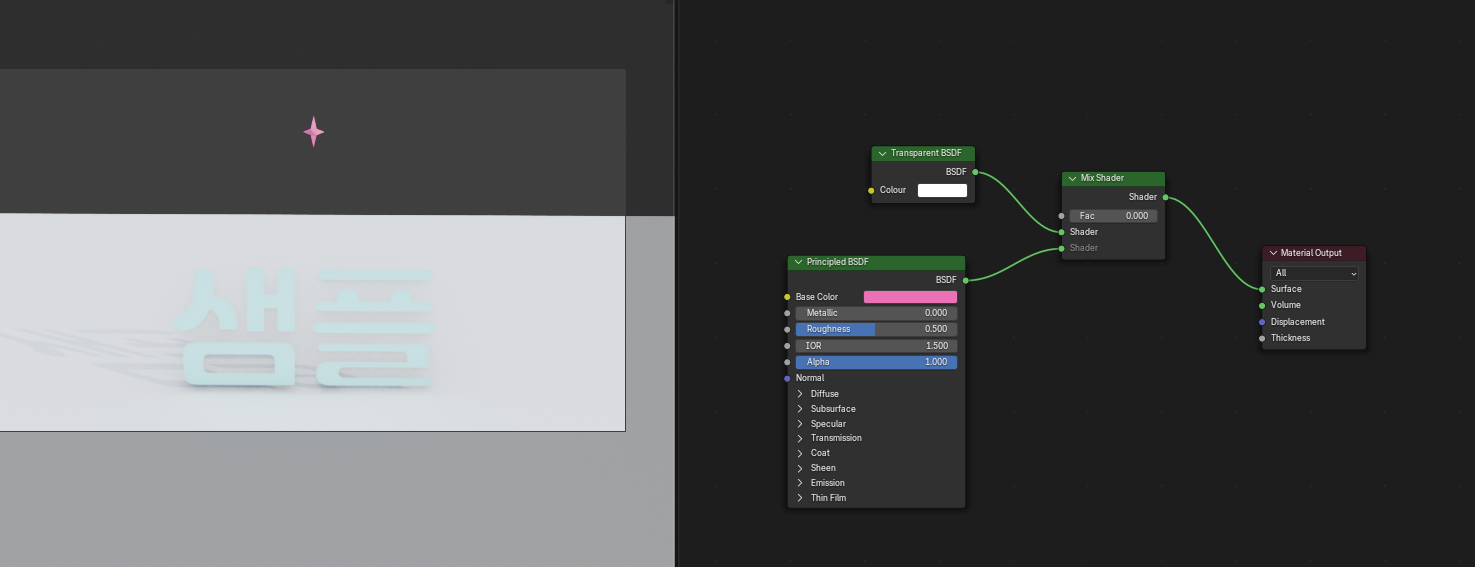머티리얼 믹스 쉐이더 추가로 알파값 생성 가능